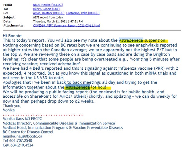 Internal communications from March 11, 2021, indicate BC CDC staff raised concerns about AstraZeneca safety, including lot holds and a Bell’s Palsy signal. Dr. Henry’s statements expressing confidence in AstraZeneca’s safety contrast with these concerns, raising questions about the intents of her public messaging.