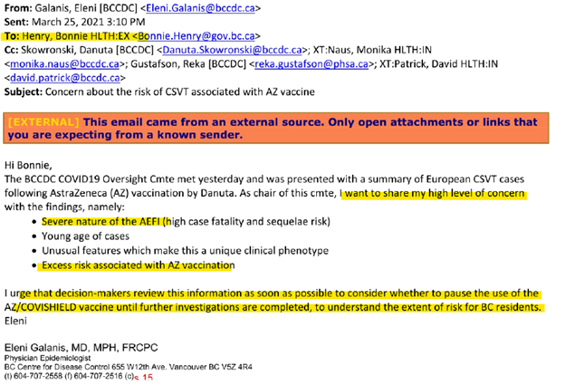 Ten days after Dr. Henry's March 15th AEFI remarks, Dr. Eleni Galanis wrote to both Dr. Henry and Dr. Naus recommending they "put the brakes on the AstraZeneca vaccine distribution" and noting "excess risk associated with AZ vaccination."