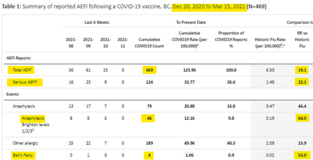 On the morning of March 15, 2021, Dr. Henry received an internal BC CDC AEFI report8 that showed alarming safety data about COVID-19 vaccines compared to historical flu vaccine baselines. Hours later, she held a press conference where she made several statements not aligned with this safety data.