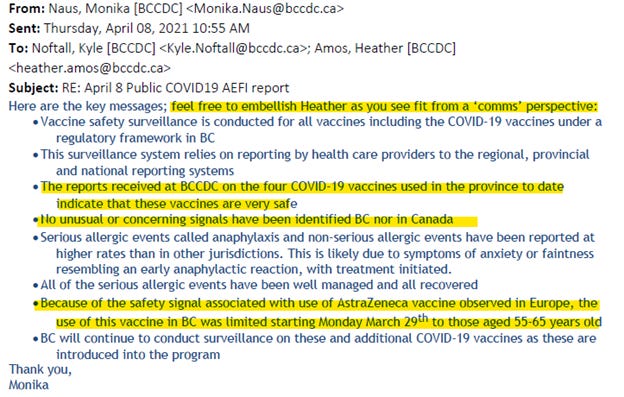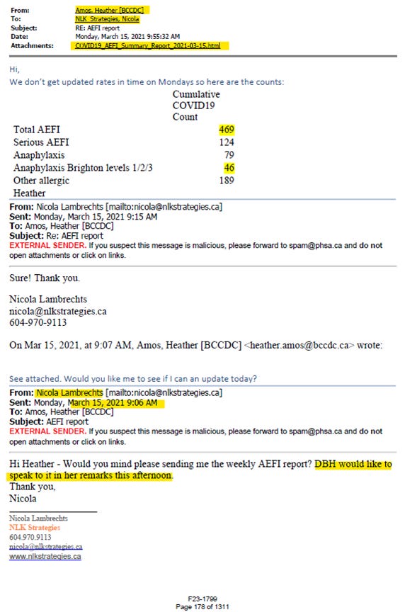 Drawing from over 1,300 pages of AEFI data and related emails released by the Provincial Health Services Authority (PHSA) under Freedom of Information request F23-1799, this opinion post highlights differences between the non-public AEFI data available to Dr. Bonnie Henry and her public communications on March 15, 2021, prompting consideration of how such data was reflected in messaging.